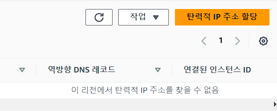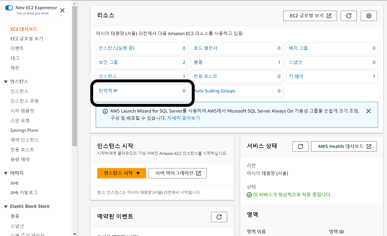 ⑦ EC2 대시보드에서 '탄력적 IP(Elastic IPs)' 메뉴를 선택 후 탄력적 IP 주소 할당 클릭