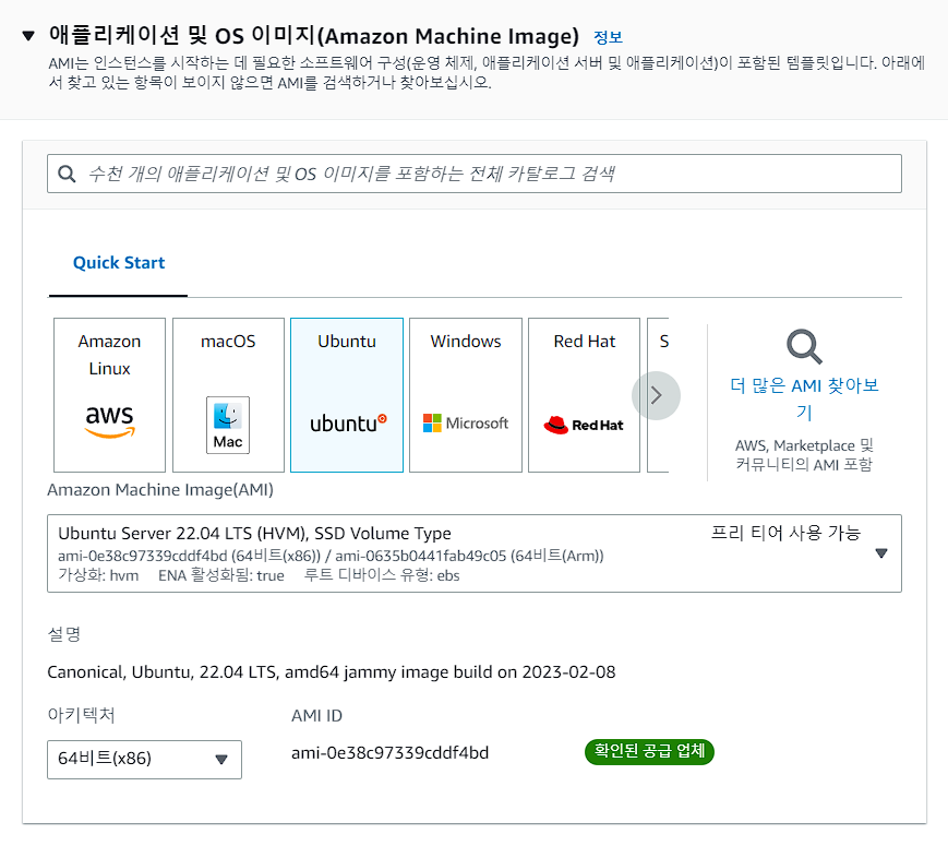 ③ Amazon Machine Image(AMI, 애플리케이션 및 OS 이미지) 'Ubuntu Server' 설정