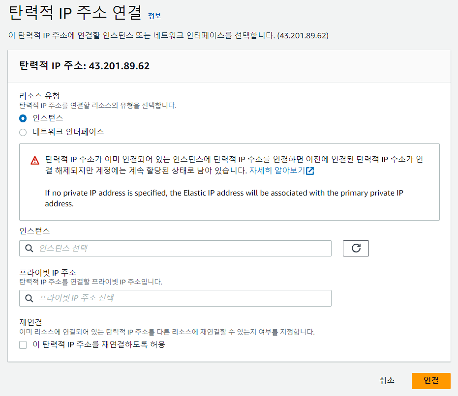 ⑧ 할당된 탄력적 IP 주소를 선택한 후, 탄력적 IP 주소 연결