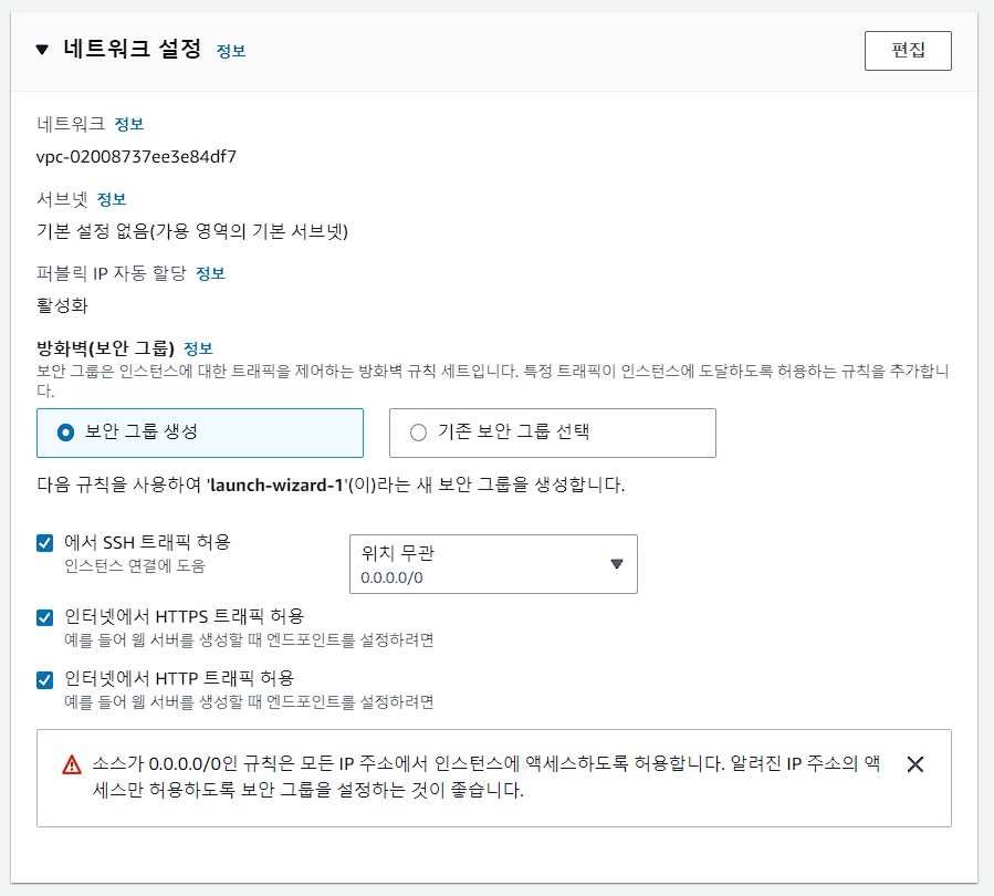 ④ 네트워크 설정에서 보안 그룹 설정과 필요한 포트를 열어준다. (일반적으로 SSH 포트(22번 포트)와 HTTP/HTTPS 포트(80번, 443번 포트)를 열어준다).