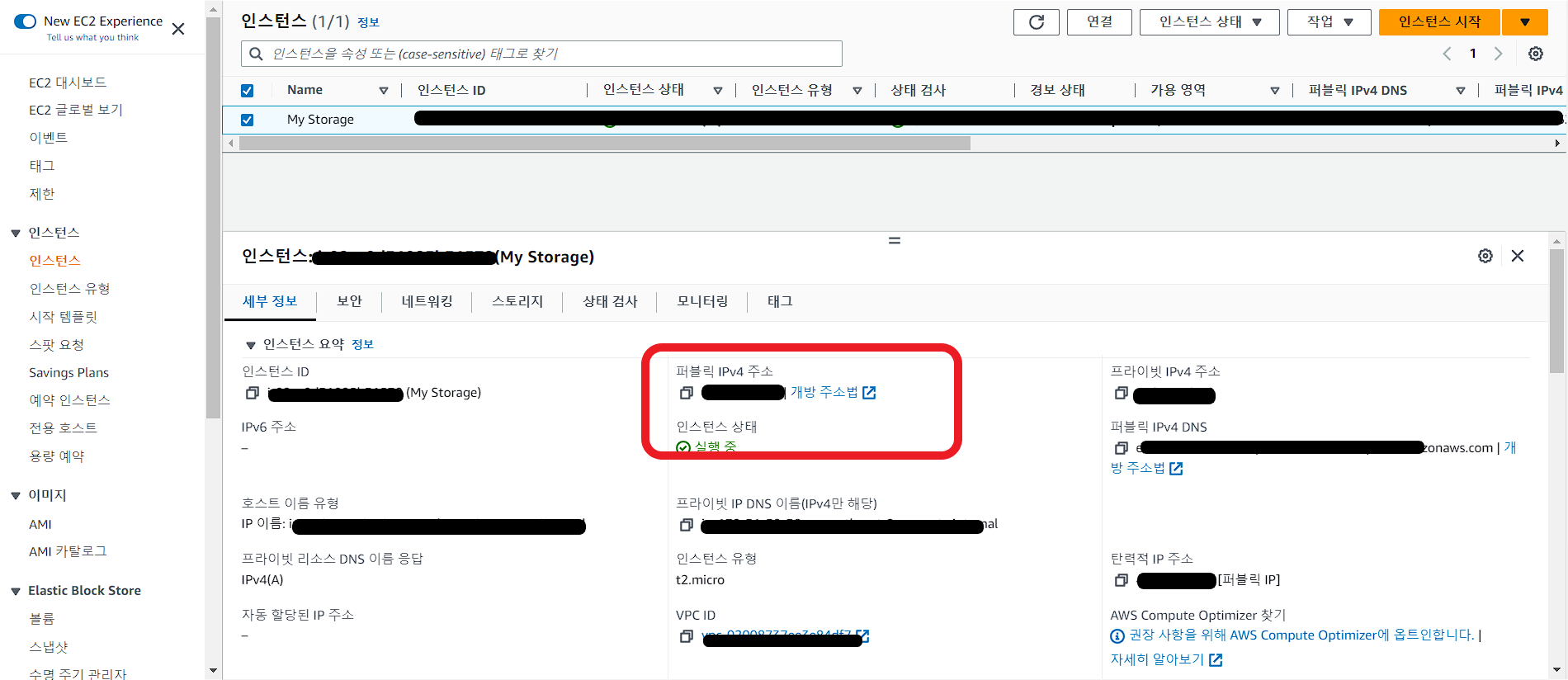 ③ AWS Management Console에 로그인 하고 인스턴스에서 '세부 정보' 탭을 클릭하고 퍼블릭 IPv4 주소 복사