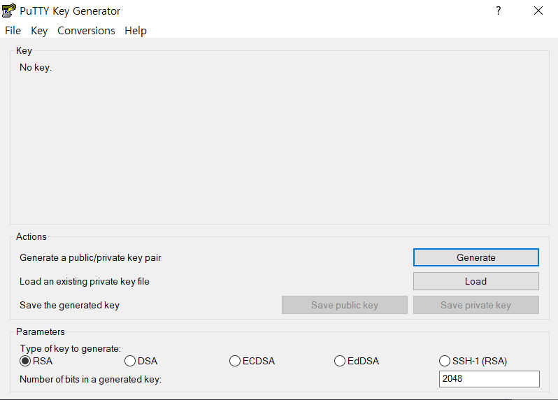 ② PuTTYgen (PuTTY Key Generator)를 실행하여 SSH 키 쌍을 생성