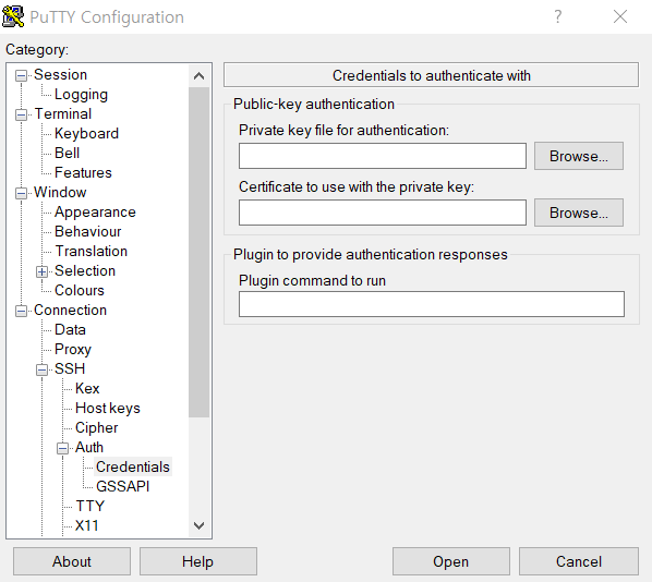 ⑤ PuTTY Configuration 창에서 'Connection' - 'SSH' - 'Auth' - 'Credentails' 항목 선택 후 'Browse' 버튼을 클릭해서 ②에서 생성한 공개키를 선택