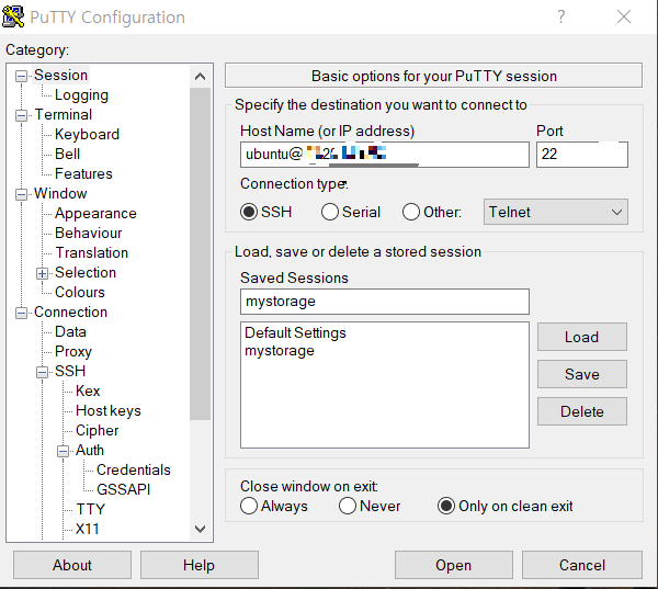 ④ PuTTY Configuration 실행하고 Host Name에 복사한 퍼블릭 IPv4 주소를 'ubuntu@퍼블릭 IPv4 주소' 형식으로 입력