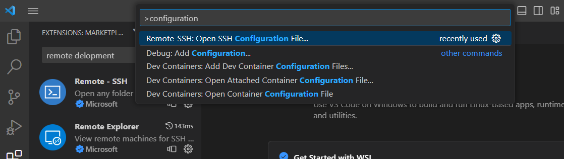 F1을 눌러 'configuration' 을 검색한 뒤 'Remote-SSH: Open Configuration File' 을 클릭한다.