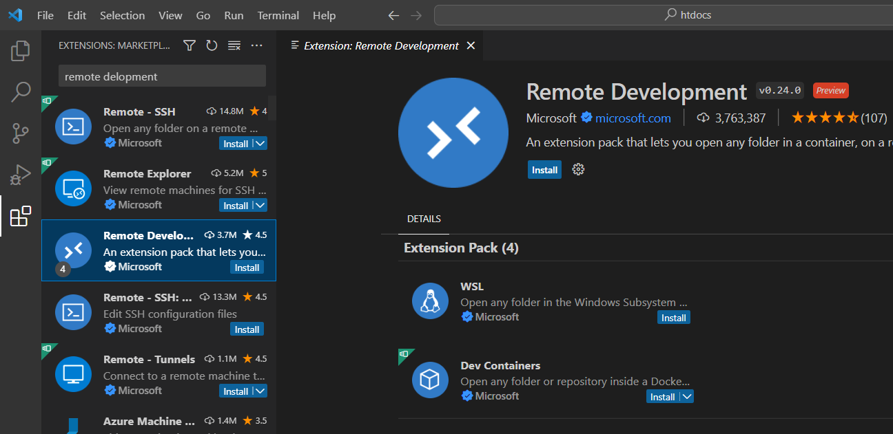 - Remote Development를 검색하고 'Remote Development' 를 설치한다.