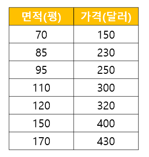 만약 위와 같은 데이터가 존재한다고 생각해보자. 위의 데이터는 주택 면적과 해당 주택의 가격 데이터를 보여준다. 이 데이터에는 독립 변수, 즉 원인인 면적이, 그리고 그것에 해당하는 종속 변수, 즉 결과인 가격이 나타나 있다.