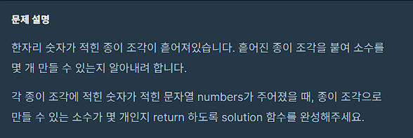 이 문제는 순열을 이용해야 한다. 다만 numbers에 있는 정수는 한번만 쓰여져야 함으로 add한 뒤에는 substring으로 제거해줬다. 문자가 0으로 시작하는것을 방지하고 중복을 허용하지 않기 위해 Mutableset을 Int로 만들고 순열이 완료가 되면 만들어진 set에 있는 숫자가 소수인지 판별하고 그 숫자를 출력해 주었다.