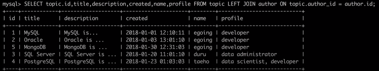 위에는 author와 topic 테이블이 생성되어져 있다. 우리가 하고 싶은것은 이 2개의 테이블을 결합하는 것이다.