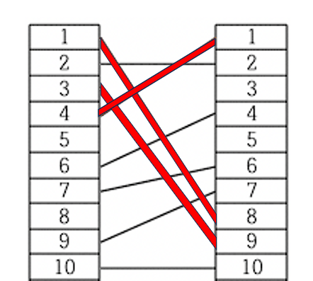 예를 들어, < 그림 1 >과 같이 전깃줄이 연결되어 있는 경우 A의 1번 위치와 B의 8번 위치를 잇는 전깃줄, A의 3번 위치와 B의 9번 위치를 잇는 전깃줄, A의 4번 위치와 B의 1번 위치를 잇는 전깃줄을 없애면 남아있는 모든 전깃줄이 서로 교차하지 않게 된다.