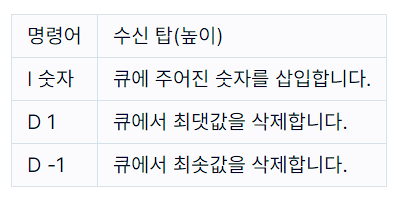이중 우선순위 큐가 할 연산 operations가 매개변수로 주어질 때, 모든 연산을 처리한 후 큐가 비어있으면 [0,0] 비어있지 않으면 [최댓값, 최솟값]을 return 하도록 solution 함수를 구현해주세요.