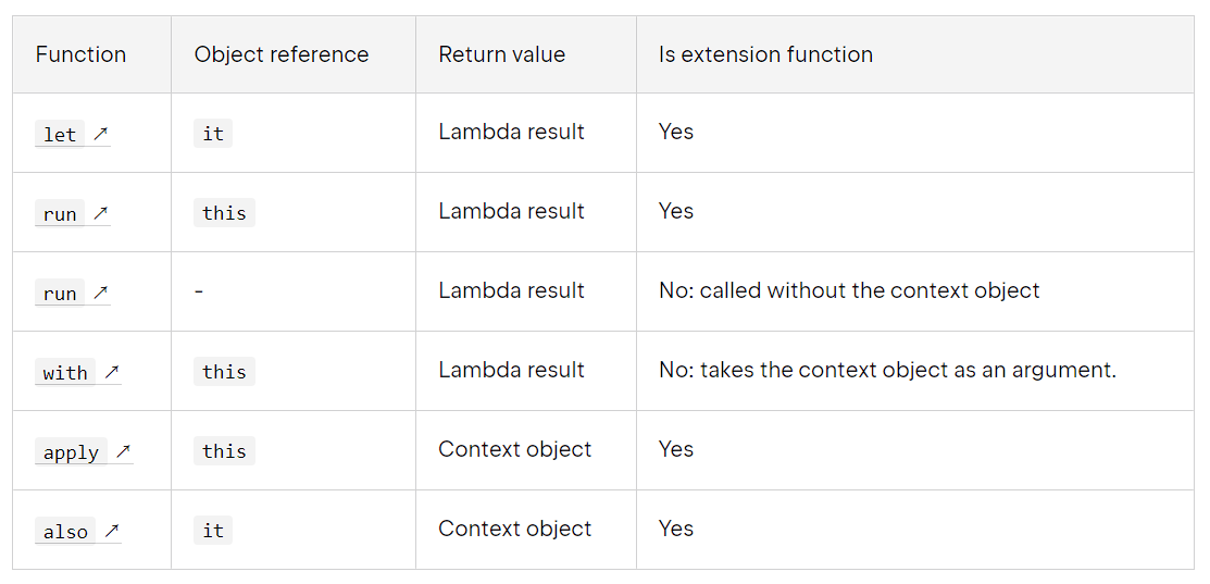 μμ ν μ΄λΈμ λ²μ ν¨μμ μ°¨μ΄μ λ€μ λνλΈ ν μ΄λΈμ΄λ€. κ°μ₯ λμ λλ κ²μ Object referenceλ itκ³Ό thisλ‘ λλμ΄μ Έ μκ³ Return valueλ Lambda resultμ Context objectκ° μλ€λ κ²μ΄λ€.