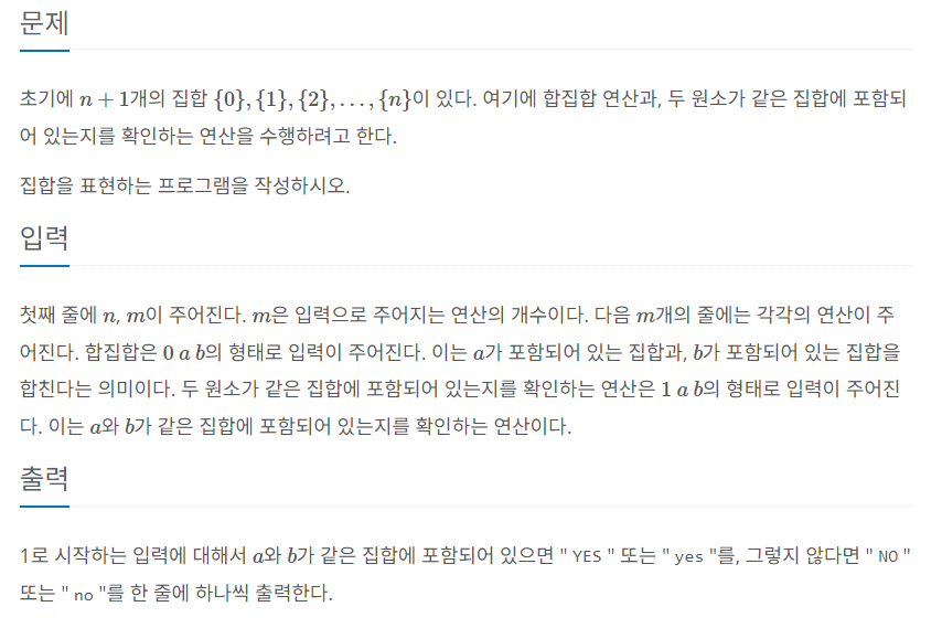 초기에 $n+1$개의 집합 $\{0\}, \{1\}, \{2\}, \dots , \{n\}$이 있다. 여기에 합집합 연산과, 두 원소가 같은 집합에 포함되어 있는지를 확인하는 연산을 수행하려고 한다. 집합을 표현하는 프로그램을 작