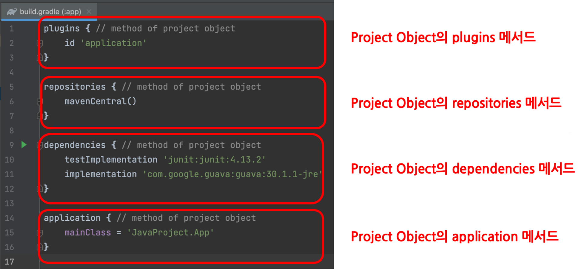 `build.gradle` 파일은 파일 자체가 Project 객체로 우리가 작성하는 각 블록이 Project 객체의 메서드가 됩니다.