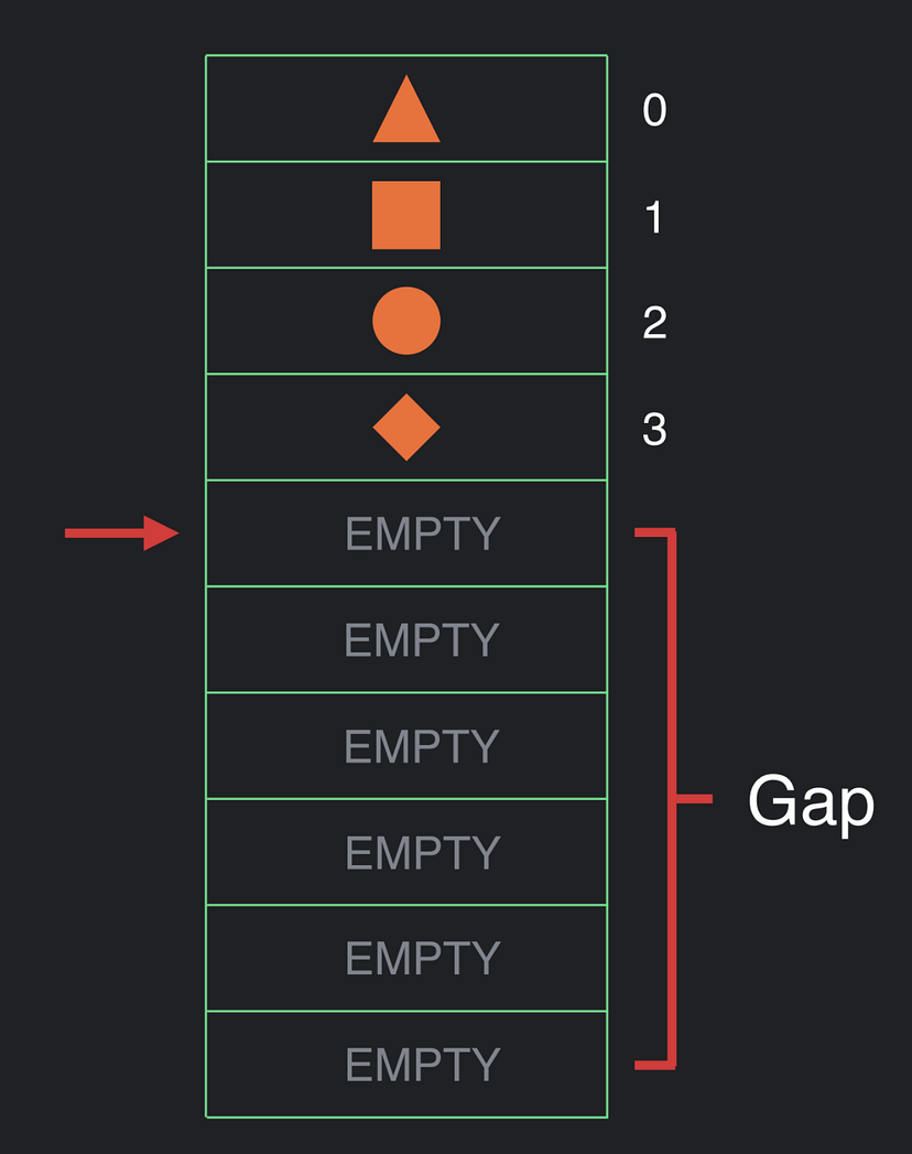 왼쪽 그림을 보겠습니다. 이 평면 배열은 나타내는 `Gap` 이라는 사용되지 않는 공간을 가지고 있어 데이터의 컬렉션 보다 큽니다.