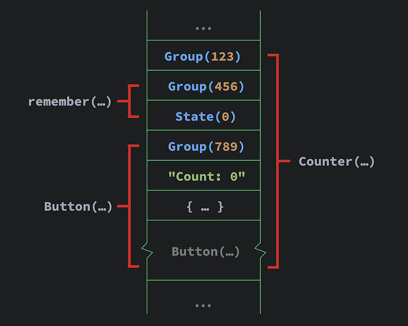 컴파일러는 어떤 코드가 UI 구조를 변경하는지 미리 알고 있습니다. 이러한 경우에 Slot Table에 이러한 그룹을 조건부로 삽입합니다. (대부분의 경우에는 UI 구조를 변경하지 않습니다.)