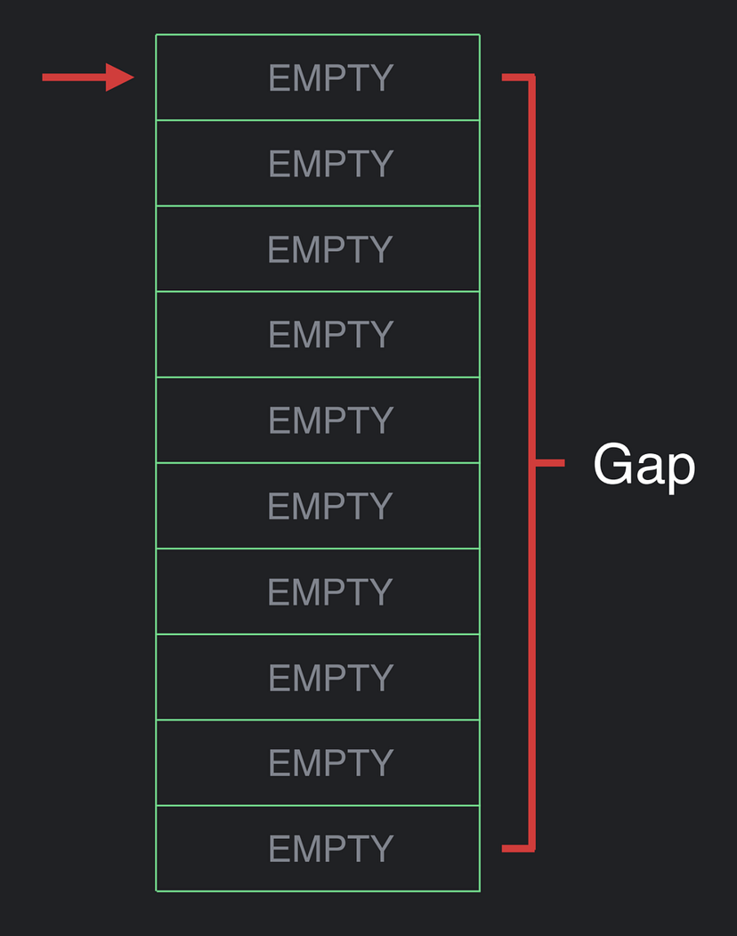 이러한 Slot Table 데이터 구조에 이해해야 할 중요한 점은 Gap을 이동하느라 O(N)의 시간이 걸린다는 점입니다. 그럼에도 불구하고 Slot Table 데이터 구조를 선택한 이유는 평균적으로 UI의 구조는 크게 변경되지 않을 것이라 판단했기 때문입니다.