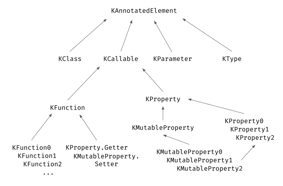 위의 그림에서 알 수 있는 것은 모든 계층의 타입이 전부 `K` 로 시작한다는 것입니다. 이는 이러한 타입들이코틀린 리플렉션의 일부이며, 자바 리플렉션과 구분하는 역할을 합니다.