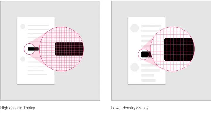 왼쪽의 그림은 오른쪽에 그림에 비해 1인치에 들어갈 수 있는 픽셀의 수가 훨신 적습니다. 그렇기에 dpi가 매우 낮게 측정됩니다. 하지만 우리는 어떤 화면에서든 동일한 크기의 결과를 확인하고 싶습니다. 이때 dp를 사용하게 되면 다양한 디바이스 간에도 동일한 크기로 보이도록 도와줍니다.