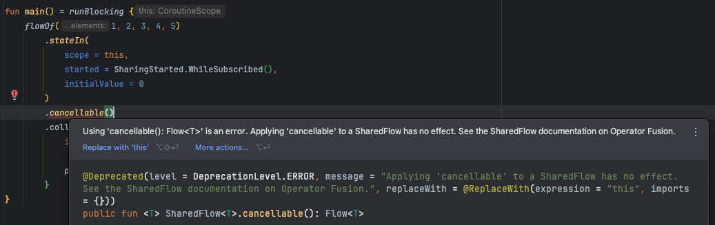 SharedFlow에 `cancellable` 연산자를 사용하면 아래와 같은 에러가 발생합니다. SharedFlow는 기본적으로 취소 가능한 구조를 가지고 있어서 `cancellable` 를 추가로 호출해도 의미가 없습니다. 그렇기에 이를 사용하는 것은 오류라고 알려줍니다.