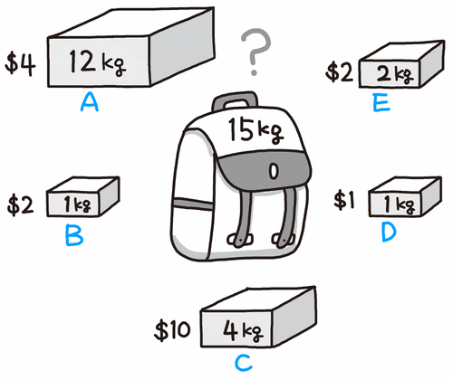 그림과 같은 열린 상자에 든 금괴를 도둑이 훔처간다고 가정해보자. 이 때 도둑은 자신의 배낭에 15kg를 담을 수 있고, 가치가 다른 5가지의 상자가 존재한다. 이때 도둑이 배낭에 담을 수 있는 최적의 조합은 C 4kg, B 1kg, E 2kg, D 1kg, A 7kg가 된다. 이런 형태의 문제를 분할 가능한 배낭 문제라고 한다.